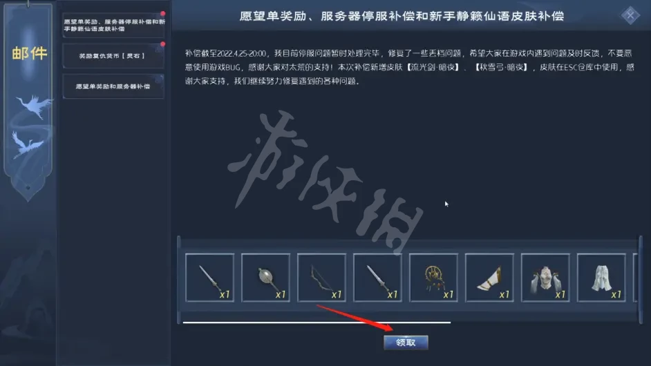 3、邮件里可以看到补偿的皮肤和武器,点击领取即可获得。