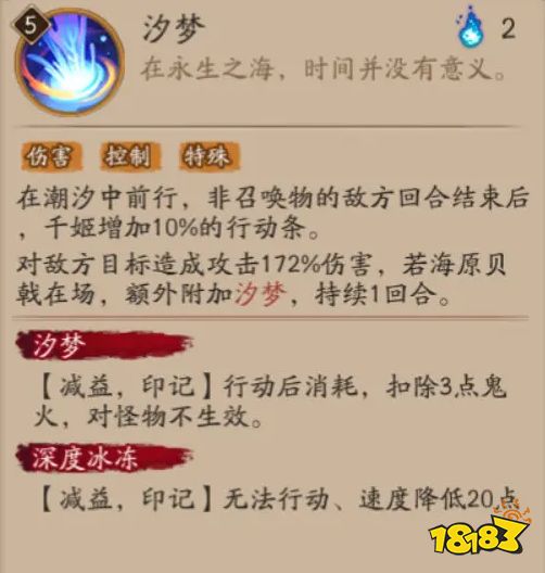 ①汐梦:印记效果,无法驱散。施加给敌方式神,会让该式神行动后被扣除3点鬼火。如果目标行动后鬼火为0,则会深度冰冻目标1个回合。
