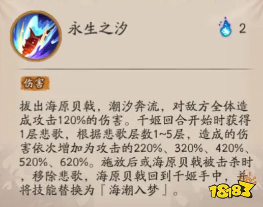 悲歌:增伤效果。千姬回合开始时获得一层悲歌,上限五层。伤害会逐层提高,最高可让伤害百分比高达620%。