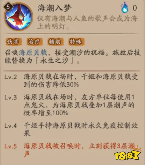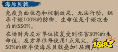 千姬未召唤海原贝戟是免疫所有控制效果,在召唤海原贝戟后,会立刻让海原贝戟获得3层潮声。