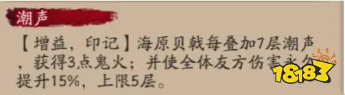 潮声:印记,不可驱散。每叠加至七层潮声,会获得3点鬼火。每次叠加成功会让我方全体伤害提升15%,最高五层,也就是最高伤害提高75%。跟缘结神的提升伤害BUFF不冲突。
