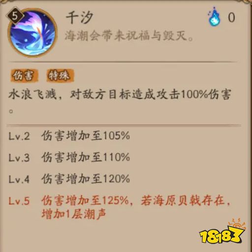 亮点在于5级满技的特殊效果:若海原贝戟存在(在场),增加1层潮声。