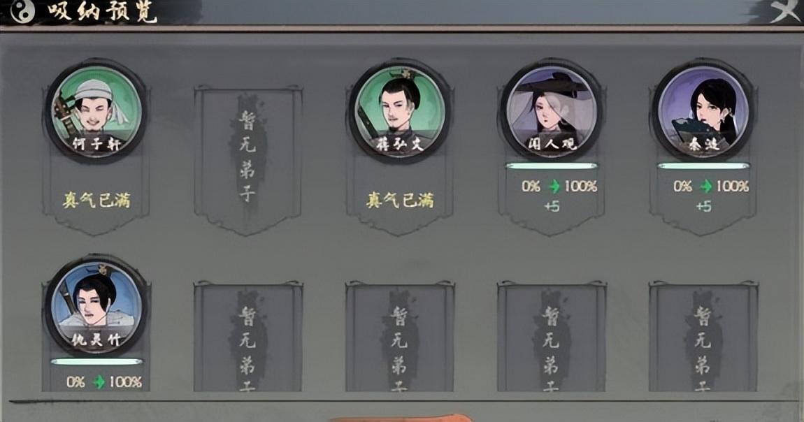 中间的部分为吸取灵药池真气的弟子队伍。点击编辑队伍将需要吸纳真气的弟子们放入灵药池后就可吸纳真气,即使弟子不在宗门内也可以吸纳真气。然后再点击吸纳真气就可以查看弟子吸纳真气后的前后变化。