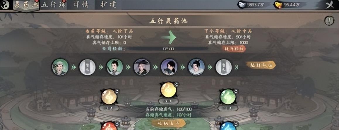 下面的部分通过提供五种五行珠提高五行灵药池的真气存储速度。提供混沌珠则可以为侠客在吸纳真气时每天额外增加真气。注意,五行珠是会损耗的。