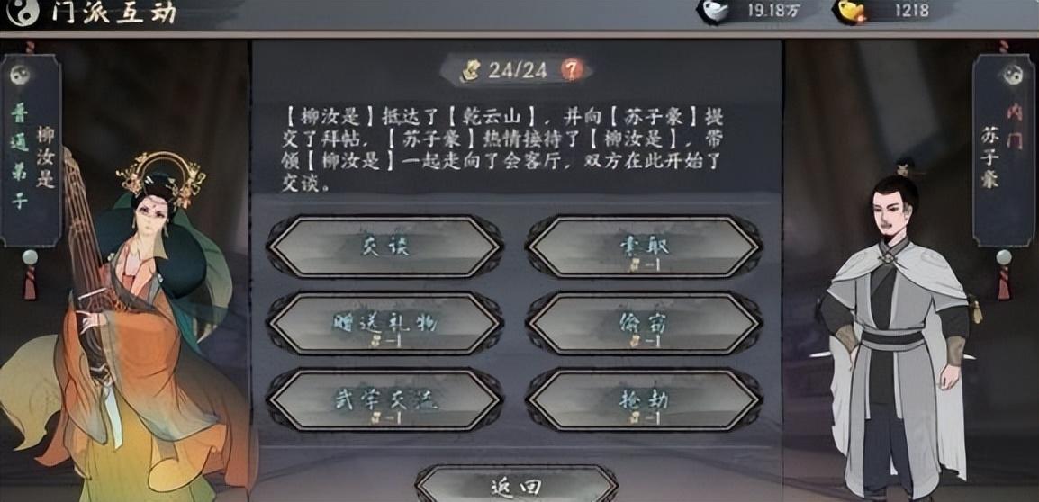 选择【交谈】按钮,可从山门值守弟子口中得知江湖轶事宗门八卦,交谈的选择会根据山门弟子喜好不同而进行好感度的增加或减少。