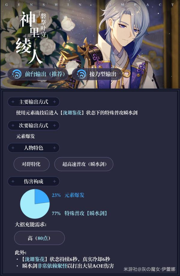 大招尽管总倍率不俗,但是出伤较慢且会被怪物分摊。因此,还是建议将神里绫人作为前台主C使用,围绕他的瞬水剑进行队伍构筑。