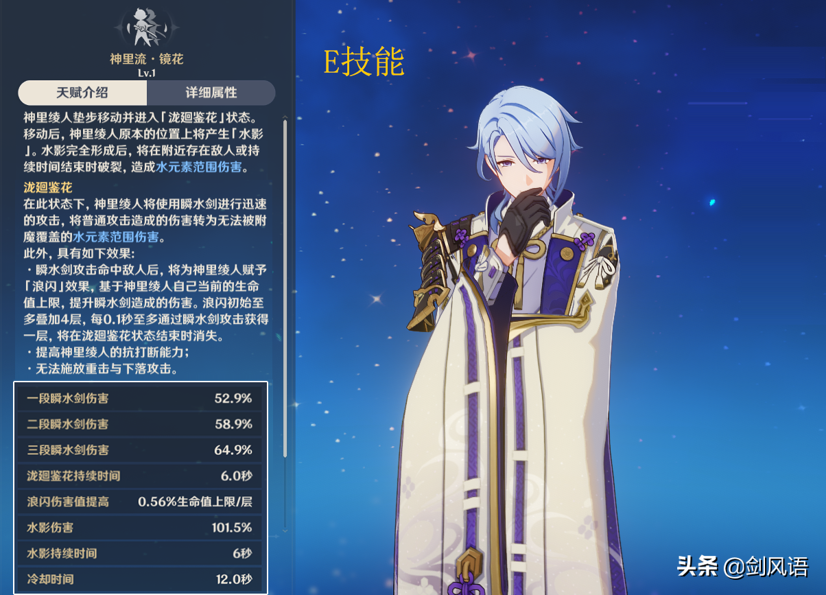 垫步移动进入「泷迥鉴花」状态,获得6秒瞬水剑普攻伤害,并留下「水影」破裂造成水元素范围伤害。