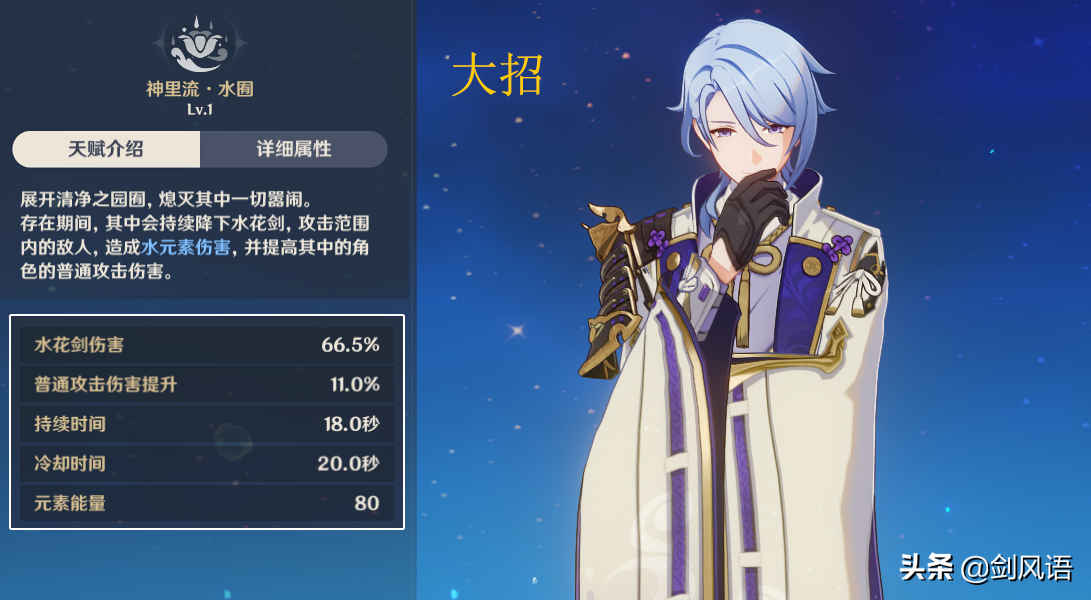 1.大招期间总计释放35次水花剑,快照机制,自动索敌,与甘雨的大招同款,连伤害倍率都一样。期间提升普攻增伤,其他角色也能吃到,相当于提升辅助能力。