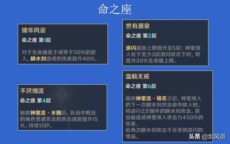 4命,大招提升普攻的攻速,提升辅助能力,对自身的瞬水剑也增加3剑左右。