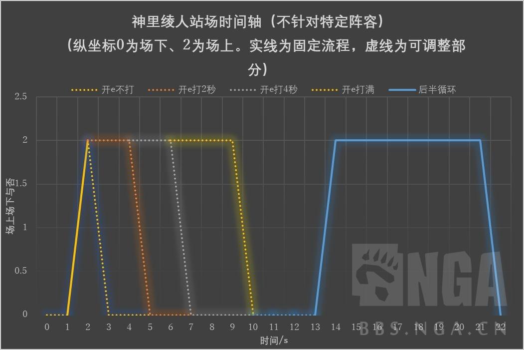 要短于被广泛认知为在单核阵容中作为主要站场角色的胡桃(7秒)、宵宫(8秒)、心海(10秒)和雷电将军(11秒),仅长于魈(3秒)和二命以上的荒泷一斗。因此在神里绫人的阵容中是没有足够的时间来允许另一位会占有大量站场时间的其他角色的存在的。你可以把这些角色理解为前述的在角色定位描述中带有周期性前缀的角色。