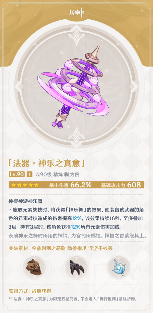 •由2.5版本活动赠送的法器,由于其高白值与百分比攻击的副词条,加上释放元素战技后提升充能的被动,也是非常适合八重神子的一把武器