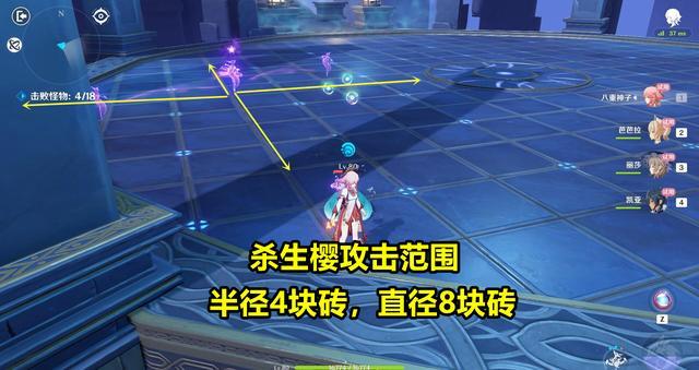 注意两个细节:(1)即使杀生樱改变攻击目标,仍然会继承攻击次数,并按次数产生元素微粒,(2)当场上只剩下1个怪物时,敌人承受两次攻击后跑出攻击范围,再跑回攻击范围,受到1次攻击即可产生1颗元素微粒。