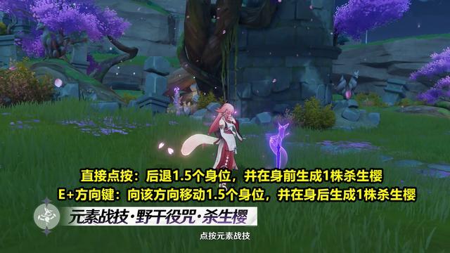 开启E技能,角色先后退1.5个身位(默认),之后在角色身前生成1株杀生樱。若按住方向键开启E技能,角色会向该方向移动1.5个身位,并在身后生成1株杀生樱。