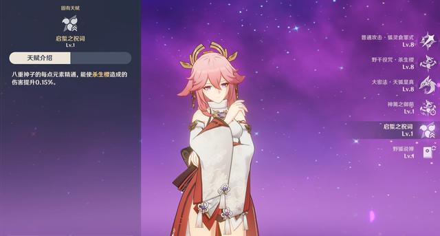 八重神子每1点元素精通增加0.15%杀生樱伤害。