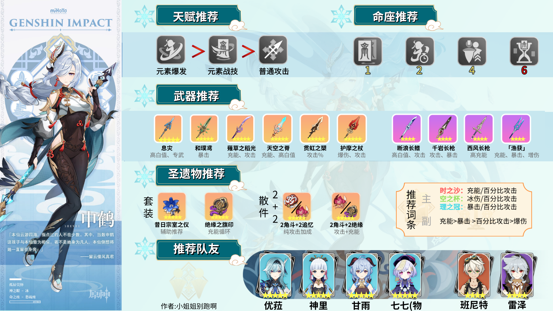 ·由于元素爆发80能量的需求及申鹤元素爆发高挂冰及减抗能力,所以我个人认为需要优先保证充能