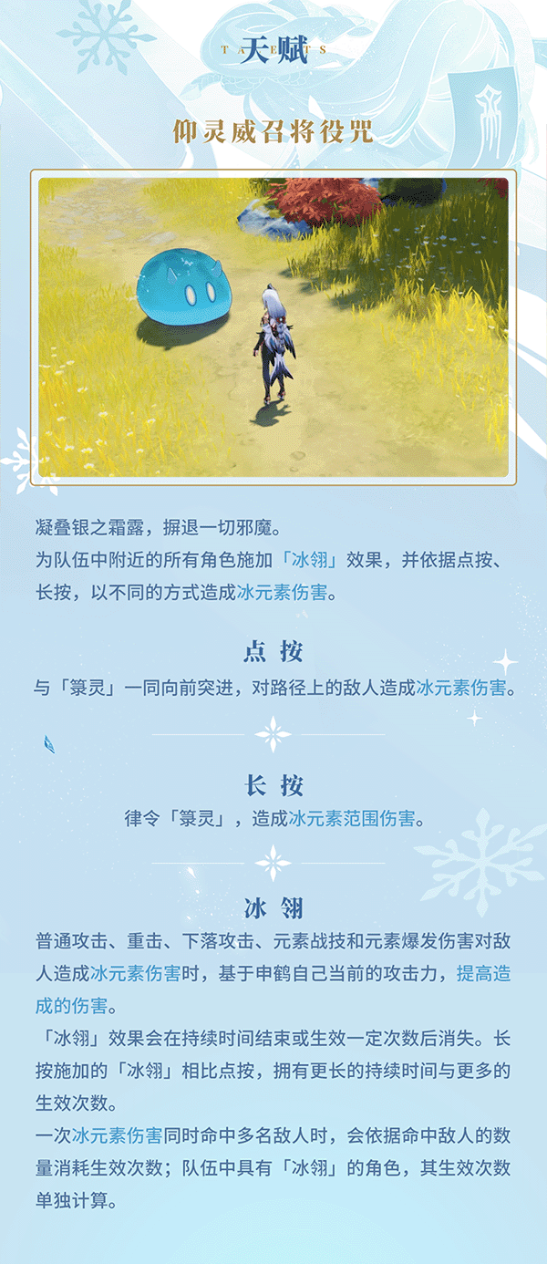 在申鹤点按/长按元素战技后,为队伍中附近的所有角色施加「冰翎」效果,并按照释放方式分别特化接下来5/7次伤害值