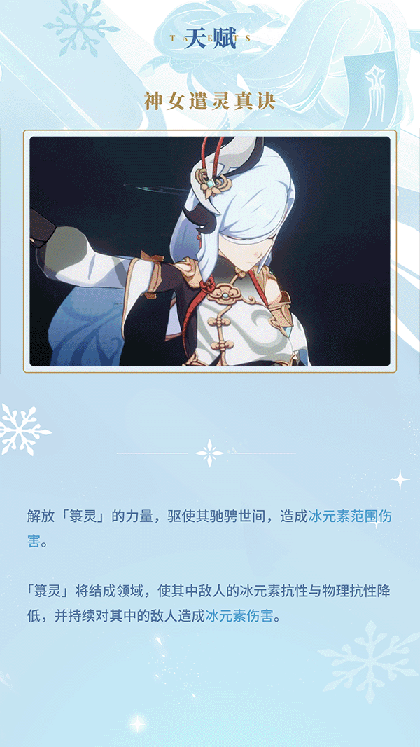 ·释放元素爆发可形成「神女遣灵真诀」的领域,处于领域内的角色冰元素伤害加成提高15%