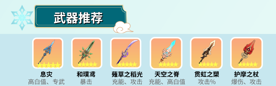 虽然个人感觉所有五星武器申鹤都能使用,但个人还是比较推荐息灾(专武)、薙草之稻光、和璞鸢以及天空之脊