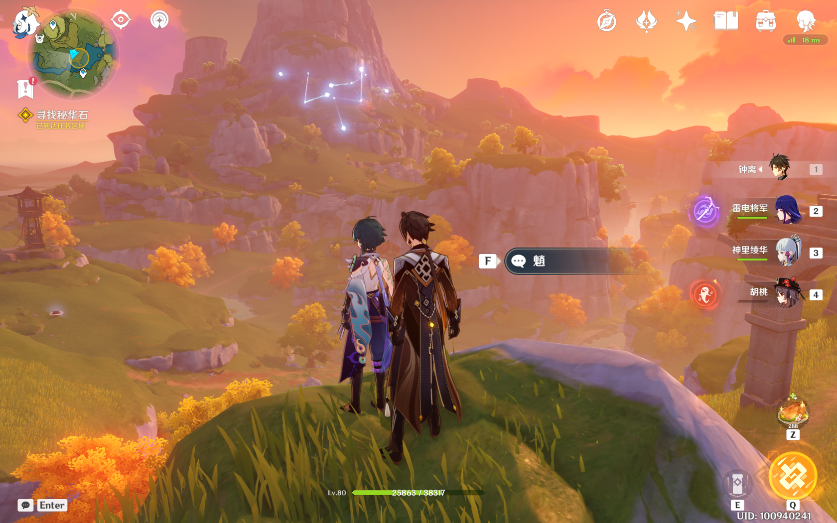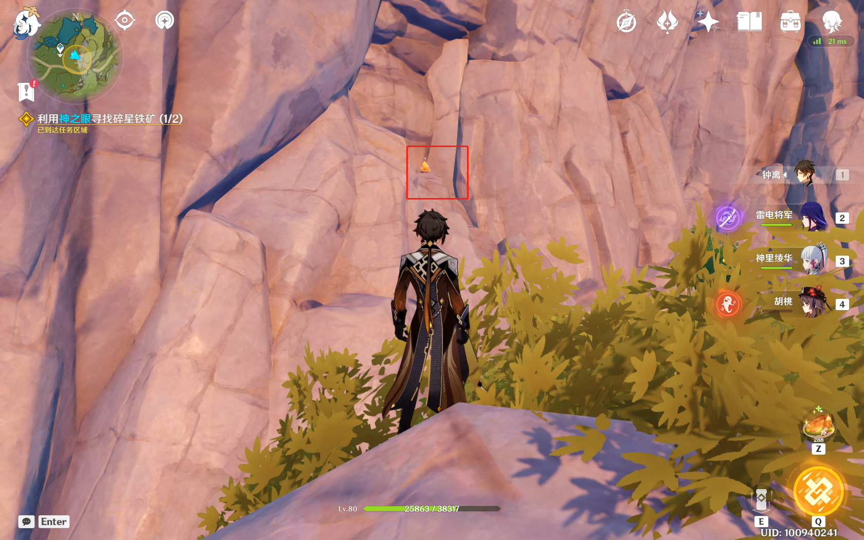 碎星铁矿:制作任务道具的材料之一,提示用神之眼(以为元素视野,放了半天),其实就在山顶或者悬崖边,一个在图中钟离所站位置,另外个在对面的山崖上。