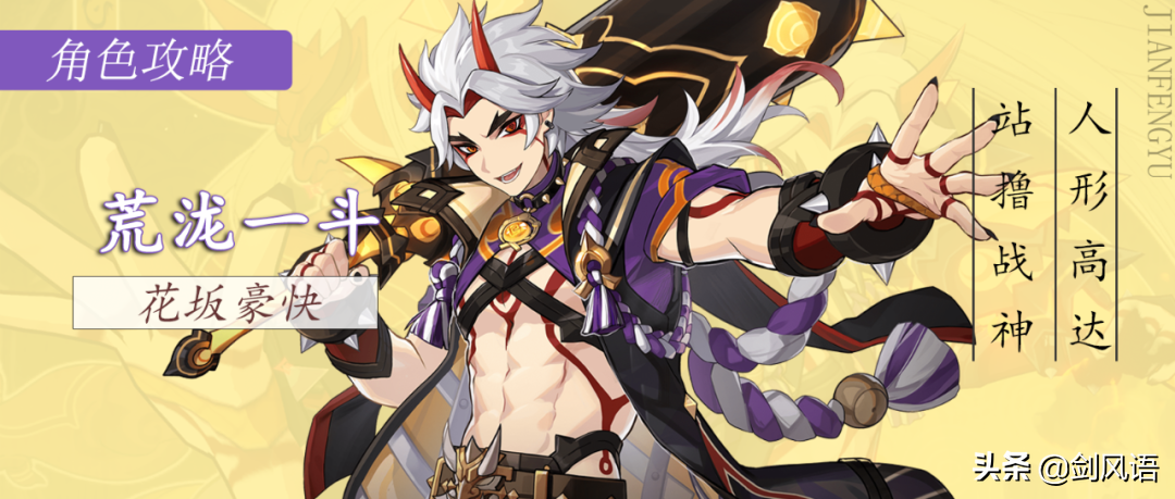荒泷一斗是岩系近战主C,独特的输出机制,由防御力转化成攻击力,而一斗又是目前所有角色中基础防御力最高的,养成就是一个面板怪,强度是岩系第一人,真正的人形高达,站撸战士!