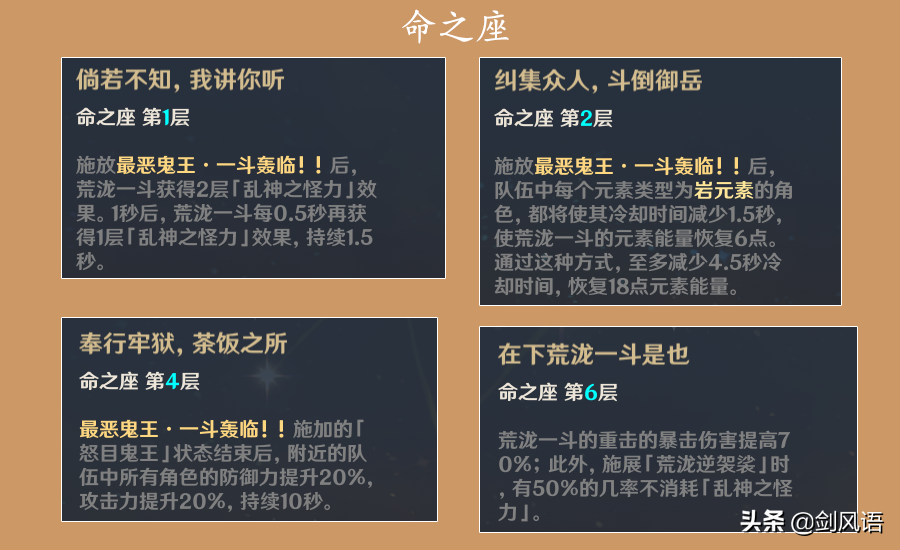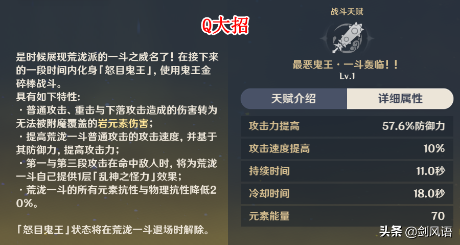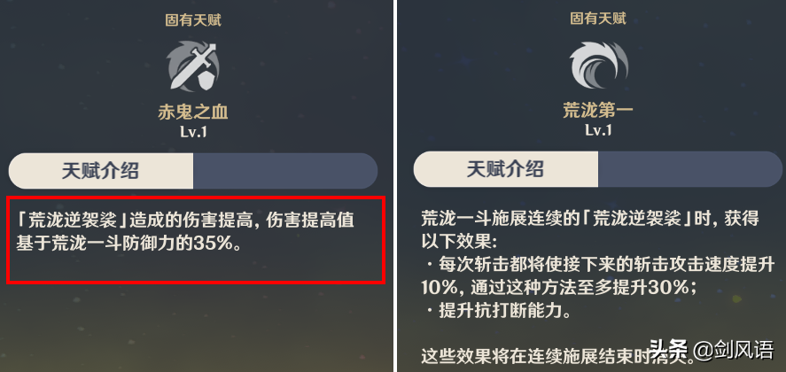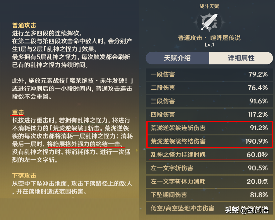 3.突破固有天赋(赤曳之血)后,「逆袈裟」伤害还提升基于一斗的防御力35%伤害。突破固有天赋(荒泷第一)后,「逆袈裟」还提升攻速和提升抗打断能力。
