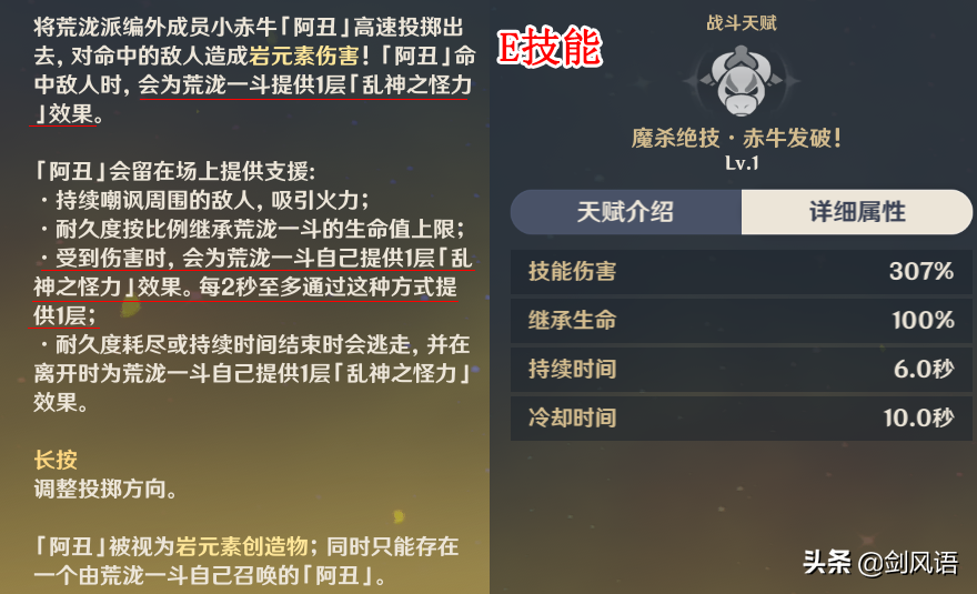 2.释放技能时「阿丑」命中敌人和每次受到攻击,都获得一层「乱神之怪力」,实战大概获得3~4层左右,因此释放E技能后,可以重击起步。「阿丑」在场只能放一个,由此带祭礼大剑被动是没用的。在场期间持续嘲讽吸引敌人,可以与钟离的柱子产生共鸣造成伤害。