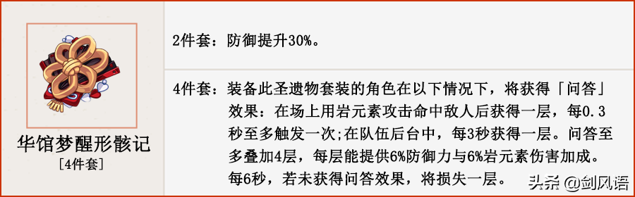 专属圣遗物套装,提升54防御力和24岩元素加成。