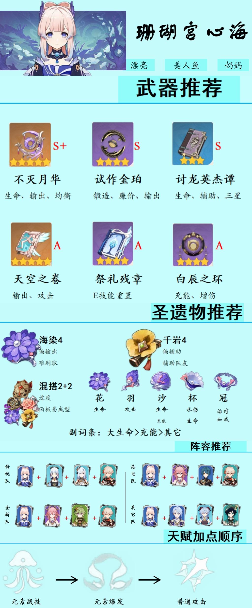 天空之卷:适合输出流心海,但表现实在一般,佩戴海染4,低精不如试作金珀。