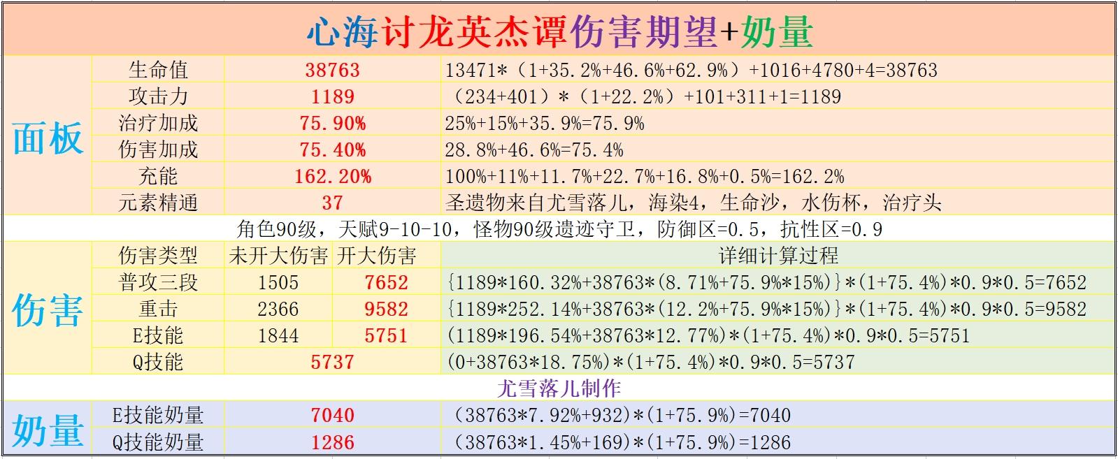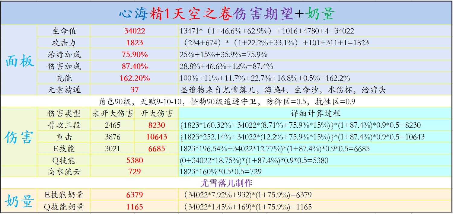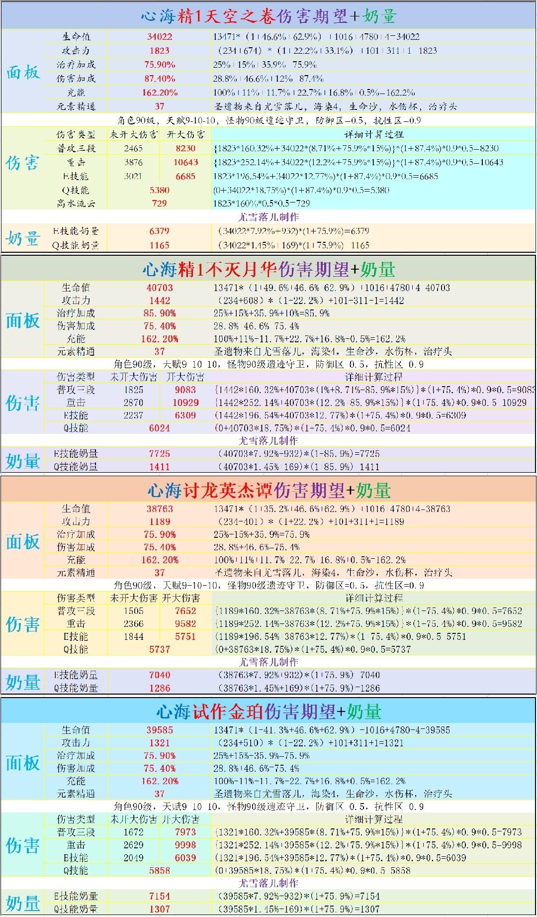 另外,心海奶量=(生命值*百分比治疗量+数值治疗量)*(治疗加成+受治疗效果加成),4w血的心海,佩戴海染4+治疗头,E技能奶量高达7200+,着实惊人。