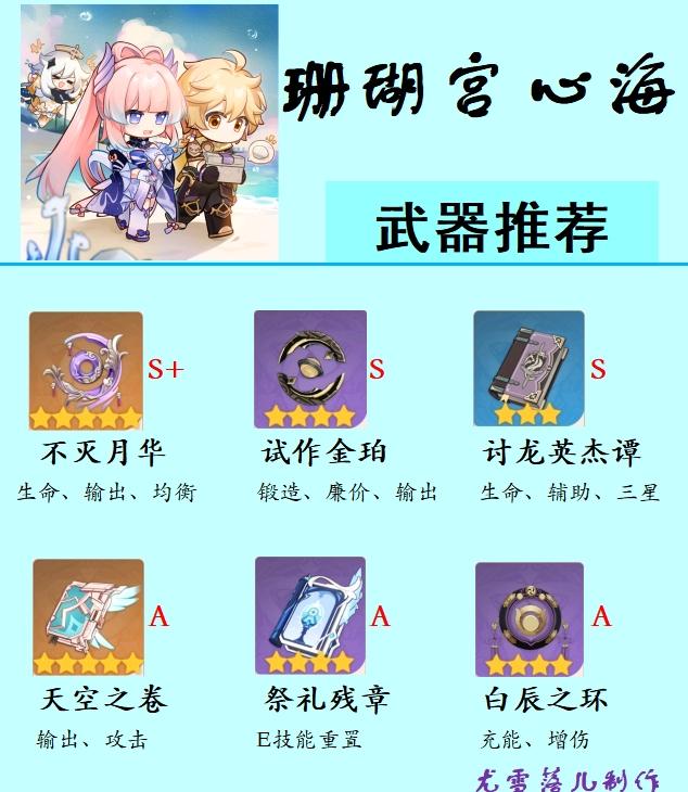 不灭月华:名义上的心海专武,不管奶量,还是伤害,都非常不错,适合主C心海,建议配合海染4一起使用。