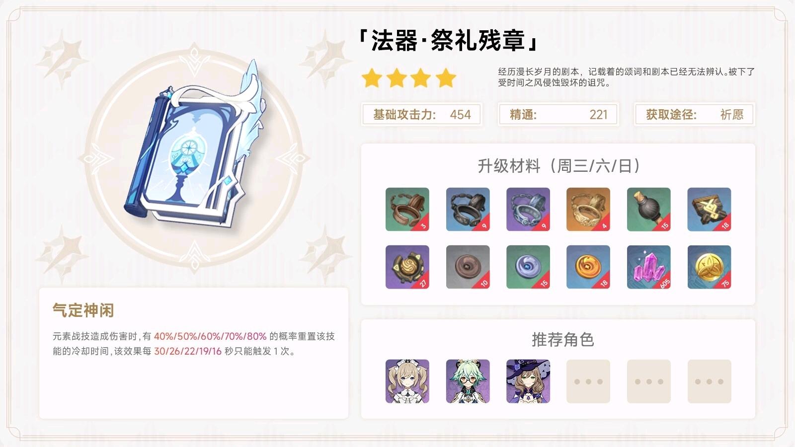武器方面,五星武器推荐不灭月华,四星武器推荐试作金珀,三星武器推荐讨龙英杰谭。在特定情况下,天空之卷、祭礼残章、白辰之环等武器也是不错的选择。