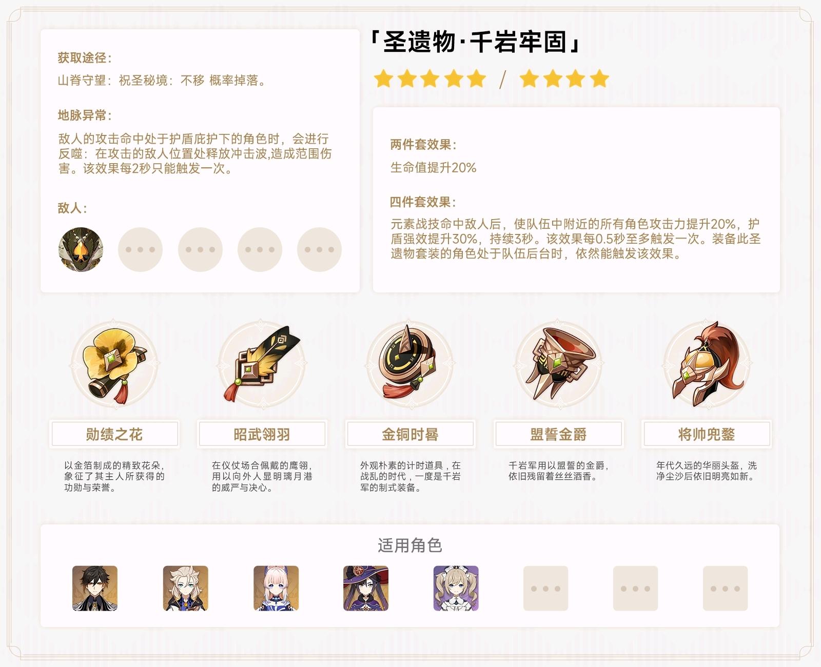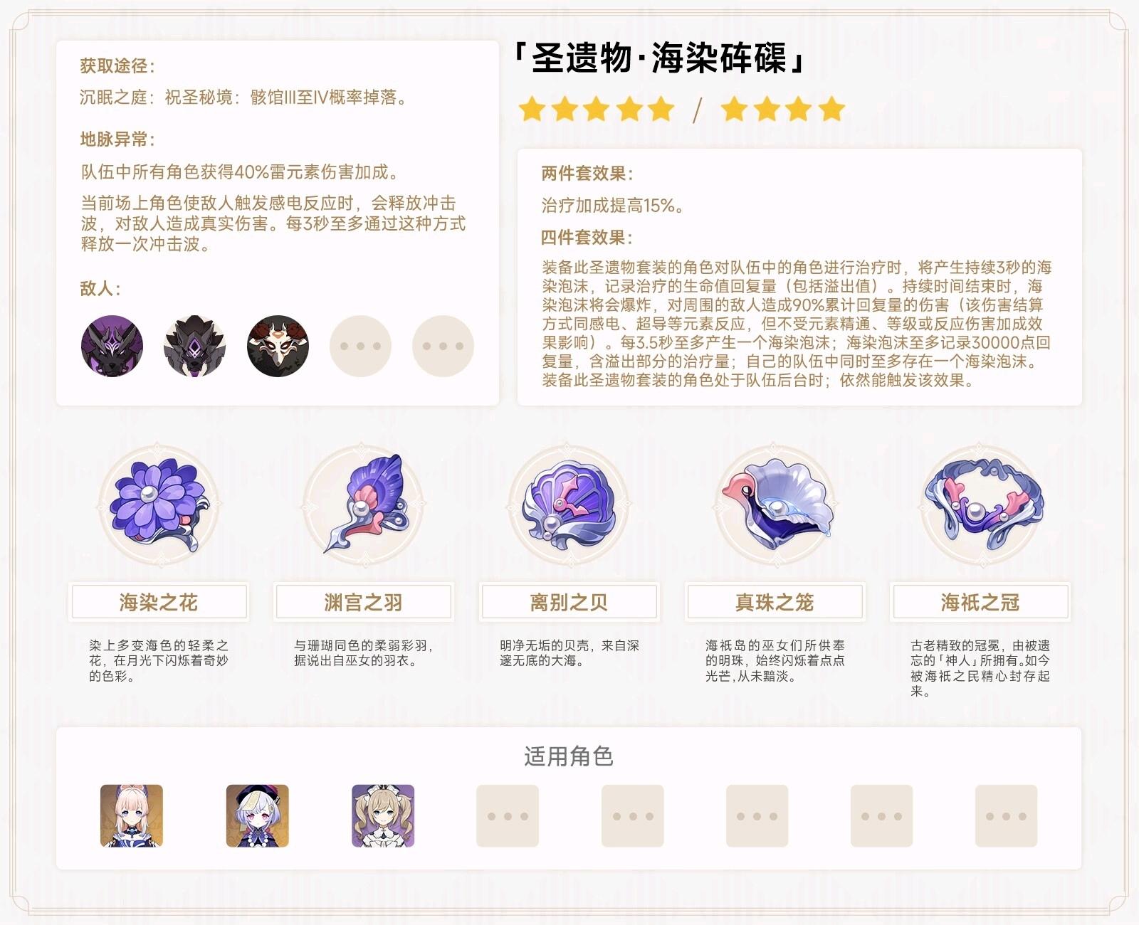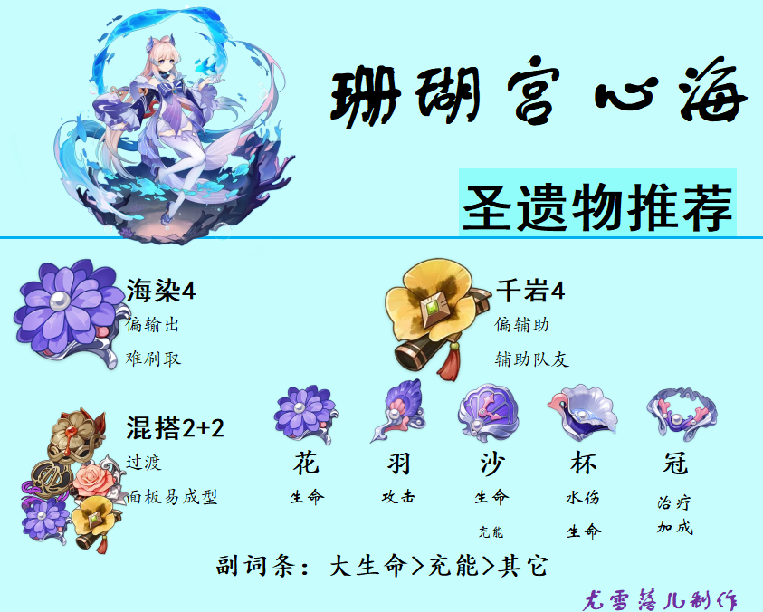 圣遗物其实只有两种选择,纯辅用千岩4,其它情况用海染4。生命沙,水伤/生命杯,治疗加成头,副词条大生命和充能优先。