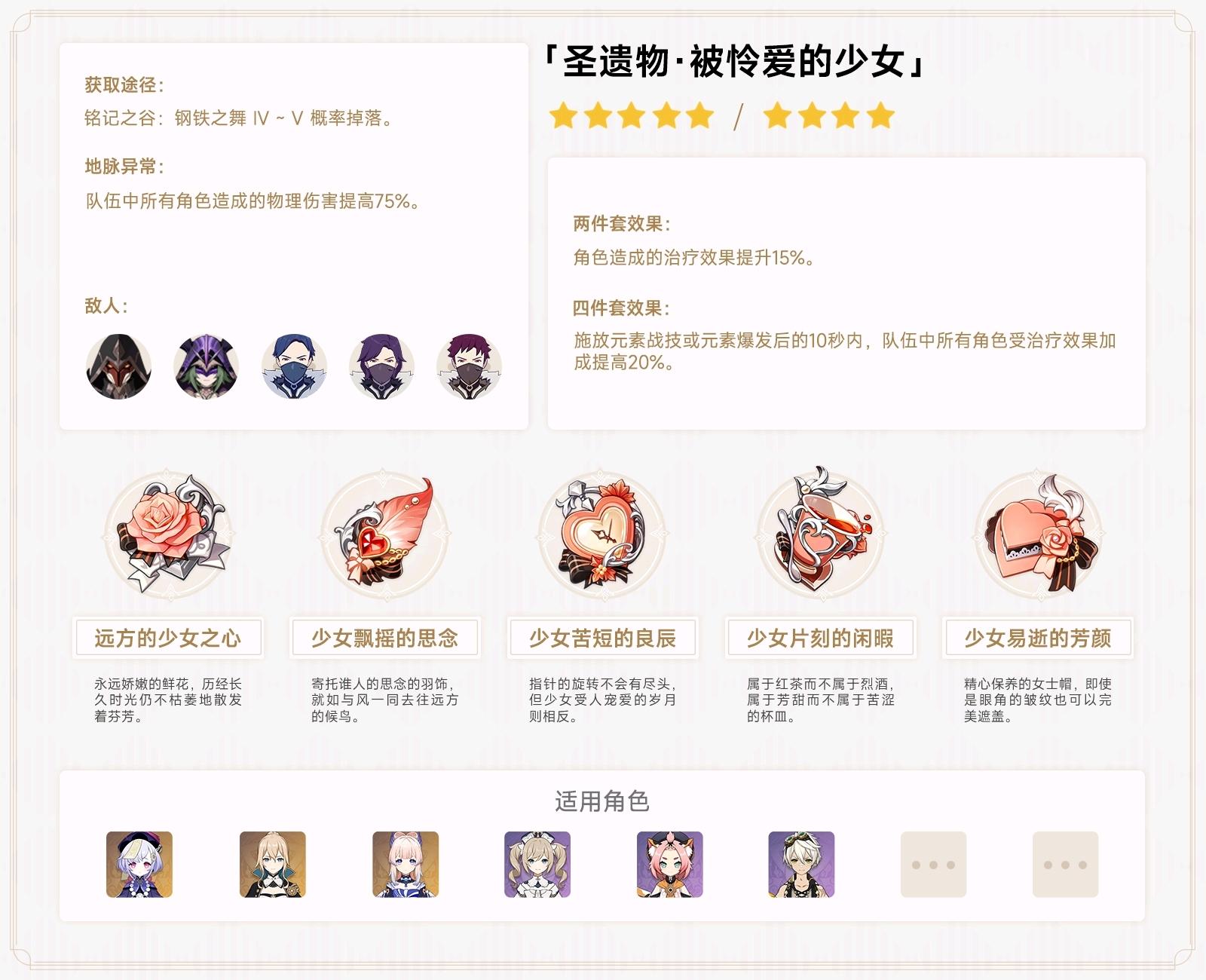 圣遗物方面,总体看,海染4>千岩4>少女4/水4,生命沙,水伤/生命杯,治疗头,副词条大生命>充能>大攻击>其它。海染和水套偏输出,千岩偏辅助,少女偏奶量。心海圣遗物小毕业简单大毕业难,海染/水套/千岩/少女2+2只适合过度,最终还是要选海染4or千岩4。
