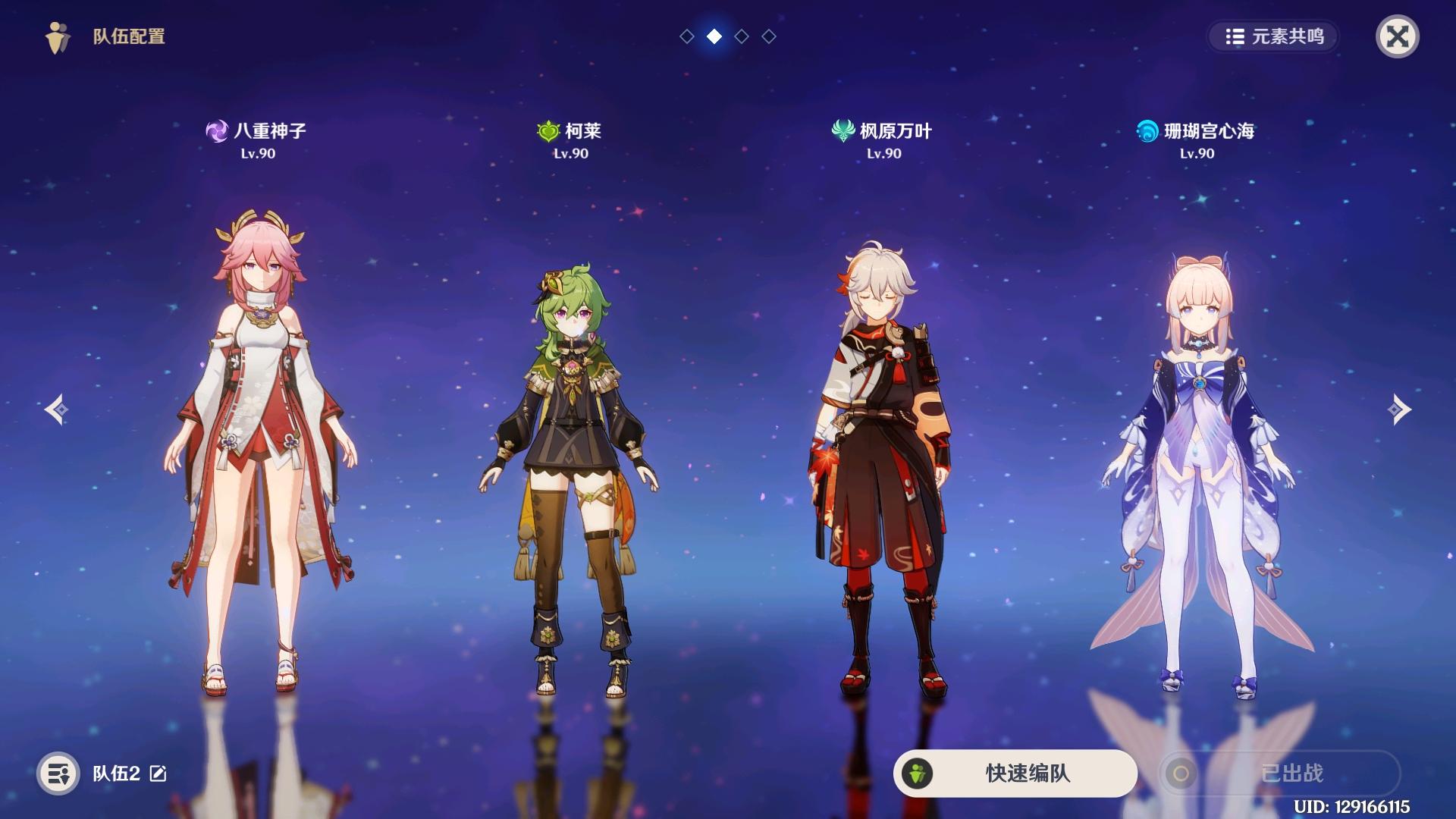 八科万心:八重神子+柯莱+万叶+心海,须弥全新玩法,八重神子可以换成刻晴、菲谢尔等雷系角色,柯莱可以换成草主,万叶可以换成钟离/夜兰等角色。类似雷神国家队,反应复杂,绽放、激化、感电、扩散都有,伤害数字不大,但伤害数字多,总体表现不错。