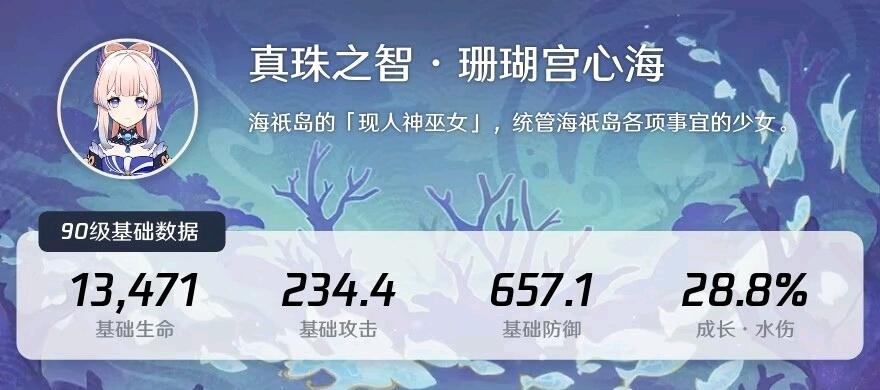 珊瑚宫心海是一位拥有出色治疗能力的五星水元素辅助型法器角色。她的元素战技的『化海月』能够持续为周围队友提供治疗效果,同时对范围内的敌人造成水元素伤害;当她开启元素爆发进入『仪来羽衣」状态后,会根据自身的最大生命值,提升「化海月」的伤害以及自身的普通攻击和重击造成的伤害;并在普通攻击、重击命中敌人时,对队伍中附近的角色进行治疗。