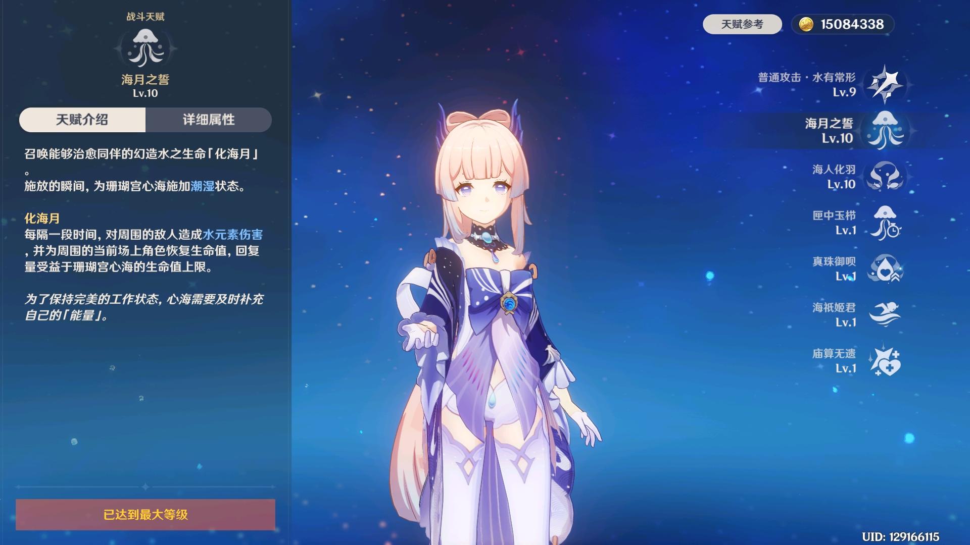 天赋命之座方面,天赋建议拉到6/9-10-9/10,首点元素战技,再点元素爆发,最后点普攻;命之座提升不是很大,如果主C,1/4/6命是重点。心海大招起手为强水,其它都是弱水,E技能为概率产球,产球期望为4.5个。