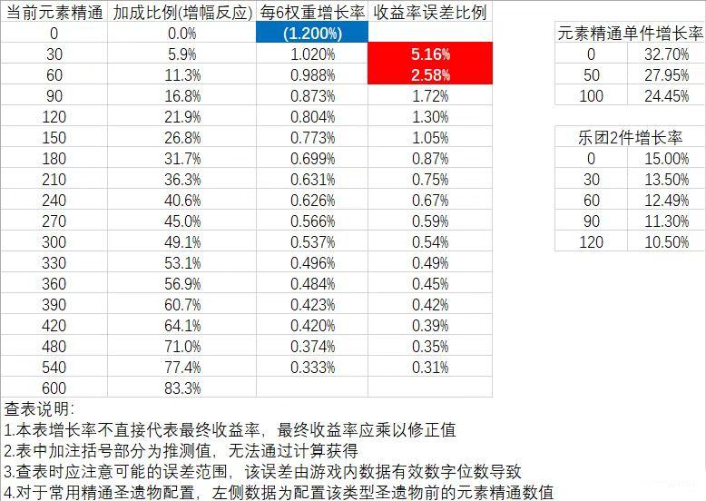 元素精通加成:先来看下元素精通本身的加成,根据米游社玩家Hanamai整理,可以看出元素精通越高增幅幅度就越低了。这里的计算公式是官方发布的增幅公式y=278*x/(x+1400),另外剧变反应公式为y=667*x/(x+1400)。