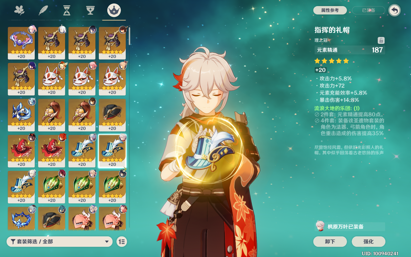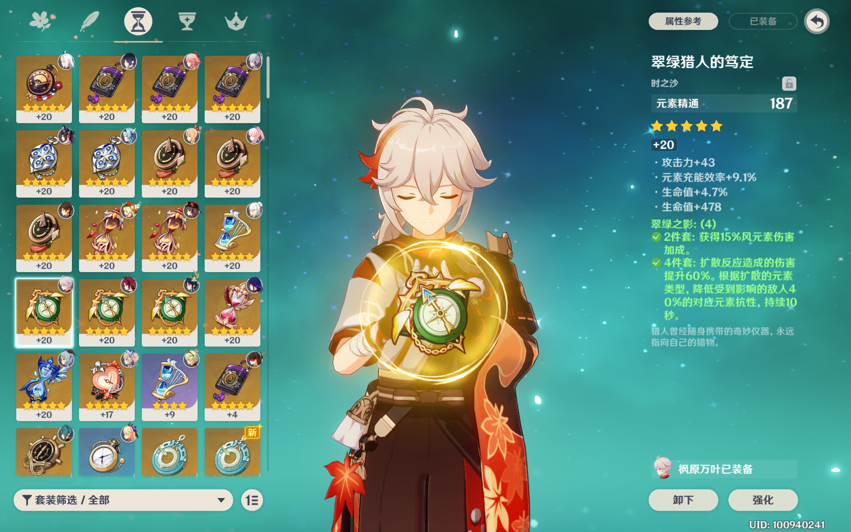 圣遗物:截止2.8版本风4件套是最优解,时之沙,空之杯,理之冠3个部位的主属性是元素精通最佳,强满总计有561点元素精通(固定值),其余就要看副属性了。