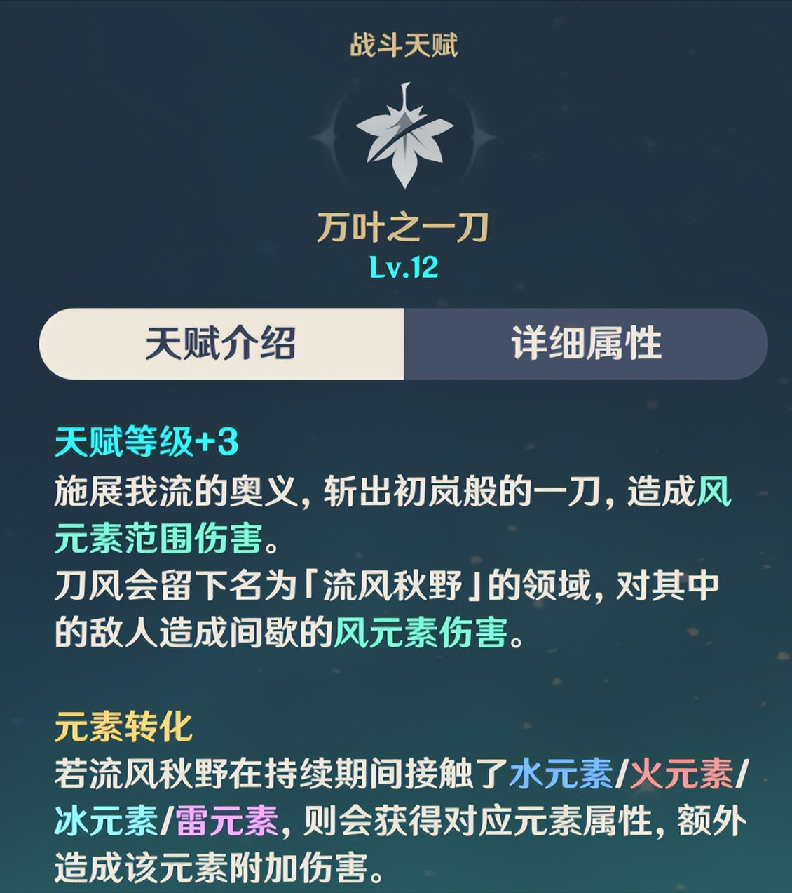 其实万叶和温迪砂糖一样,万叶的元素爆发也可以产生元素转化,优先等级为火、水、雷、冰。不同的属性持续时间和倍率不同。