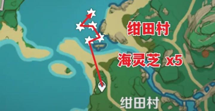 ▌首先来到绀田村北的锚点,转身向北走,来到海岸边即可采集,近距离沿着海岸走可以采集到四株,远处还有一株。