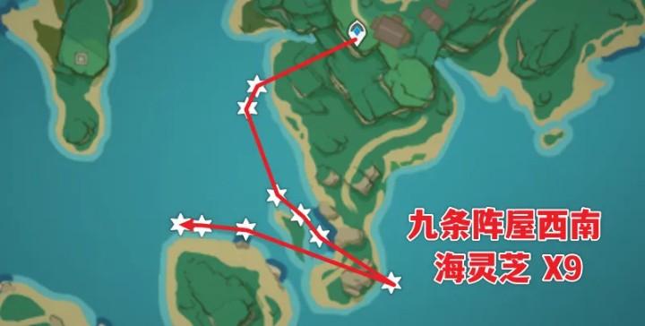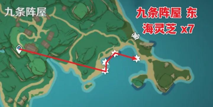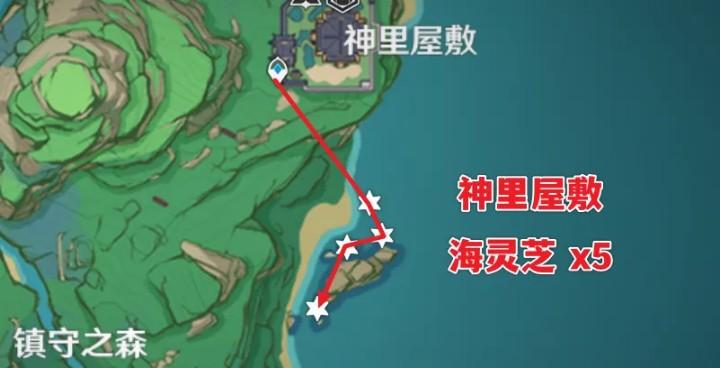 ▌然后传送到神里屋敷的锚点,转身往东南走,跳下悬崖,在浅滩处可以采集到四株海灵芝,稍远处石头后面还有一株。