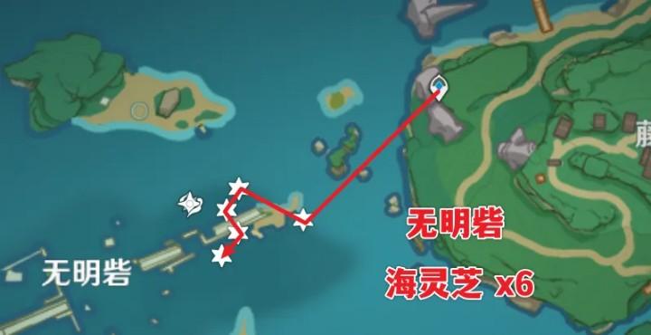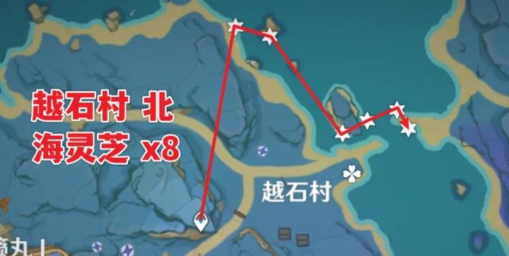 ▌传送至越石村左边的锚点,越过沟壑往北飞,海岸边可以发现三株。之后沿着海岸线往东南走,小岛的两侧各有一株。继续走,两侧的海岸均有海灵芝。