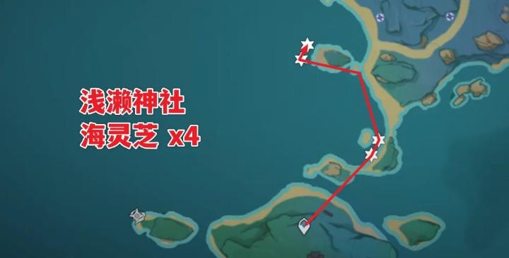 ▌传送至浅濑神社的锚点,往北走,海岸边可以发现两株海灵芝,继续沿着海岸线往北,左前方的小岛外侧能找到两株海灵芝。