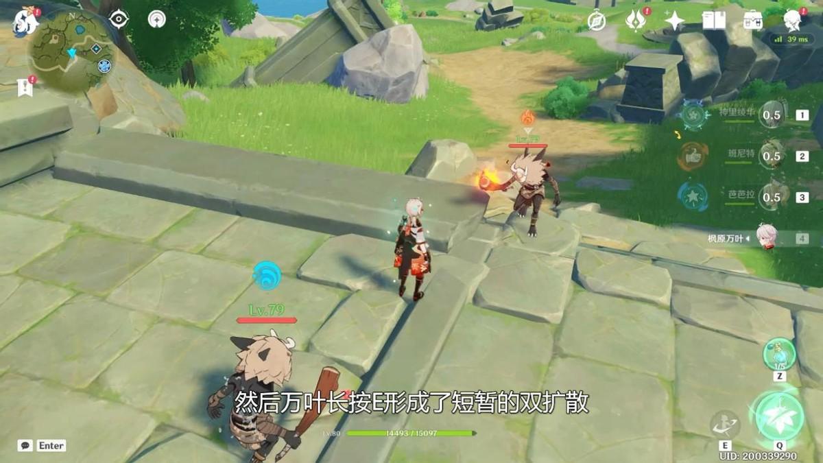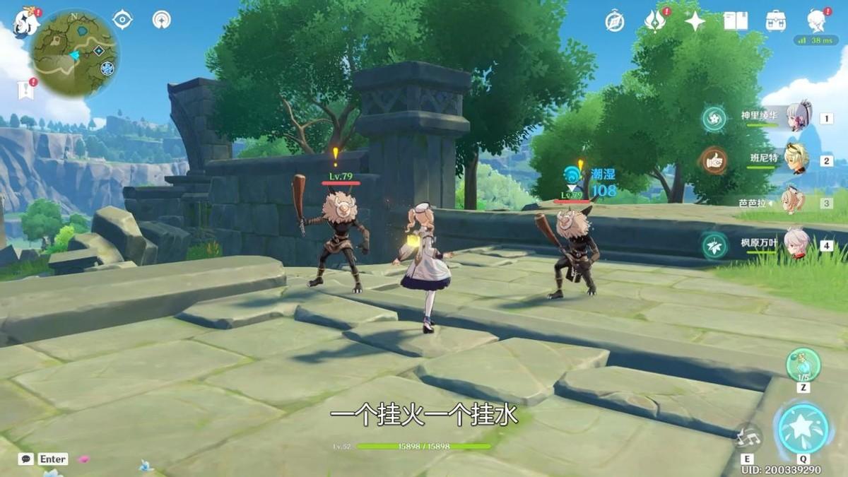 万叶如何双扩散呢,先找两个丘丘人测试一下,一个挂火一个挂水,