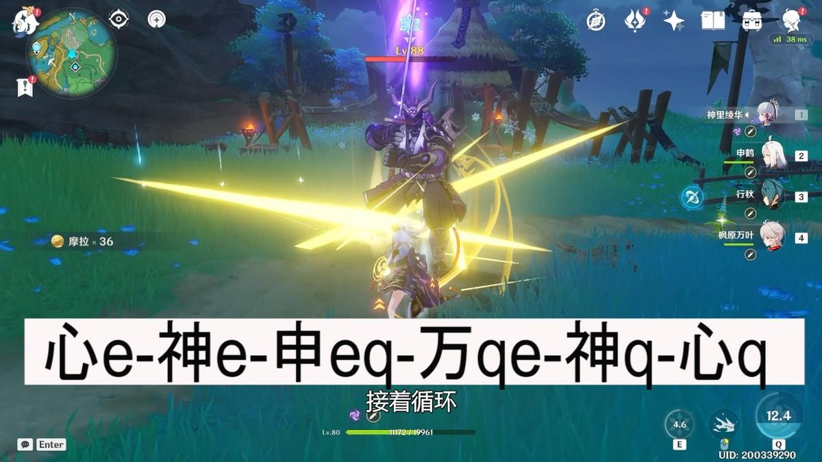 这里说明一下,神里为什么优先于申鹤开E,因为神里开E是叠武器被动,因为神里拿的是天目影打刀,如果神里有专武的话就不用提前开E,直接EQ就行,看着这个队伍很豪华,