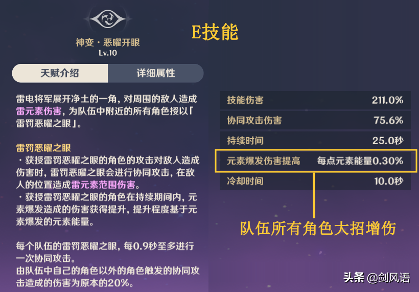 2.在E技能的25秒内,提升队伍所有角色大招伤害(包括自己),提升的伤害基于该角色的大招元素能量值,每点元素能量最高0.3%,如雷神大招90点元素能量,那就是提升27%大招伤害。