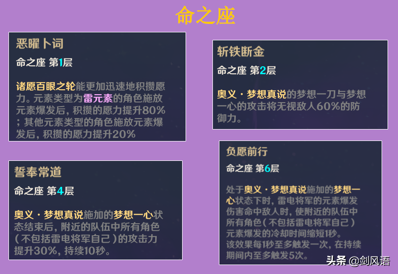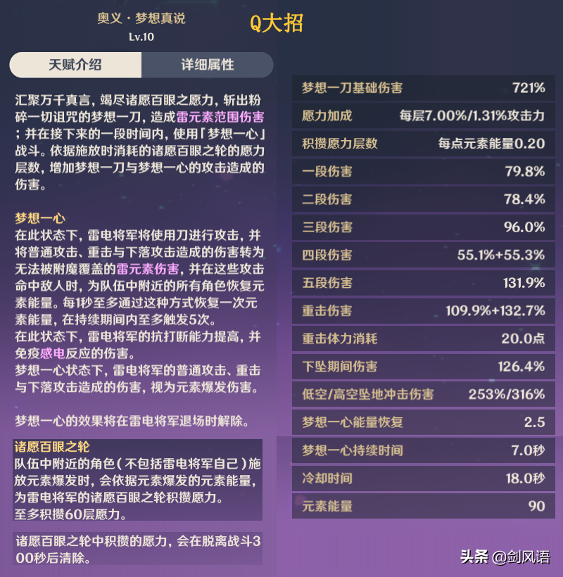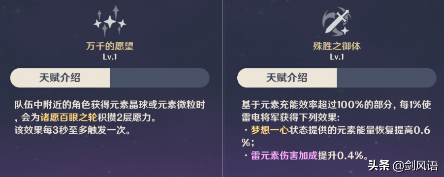元素充能效率超过100%部分,提高大招【梦想一心】能量恢复,和转化成雷元素伤害加成(该天赋改变了圣遗物属性选择,不需要带雷伤杯)。