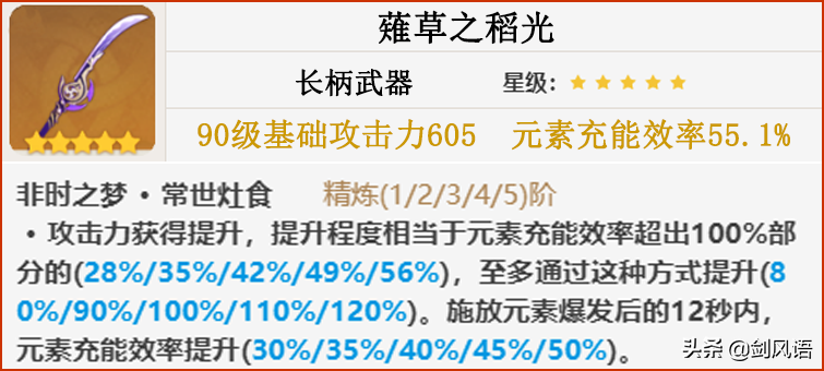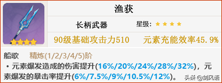 【钓鱼获取,白嫖精5】四星专武,增加元素充能效率,提升大招暴击率和伤害,与雷神非常契合。