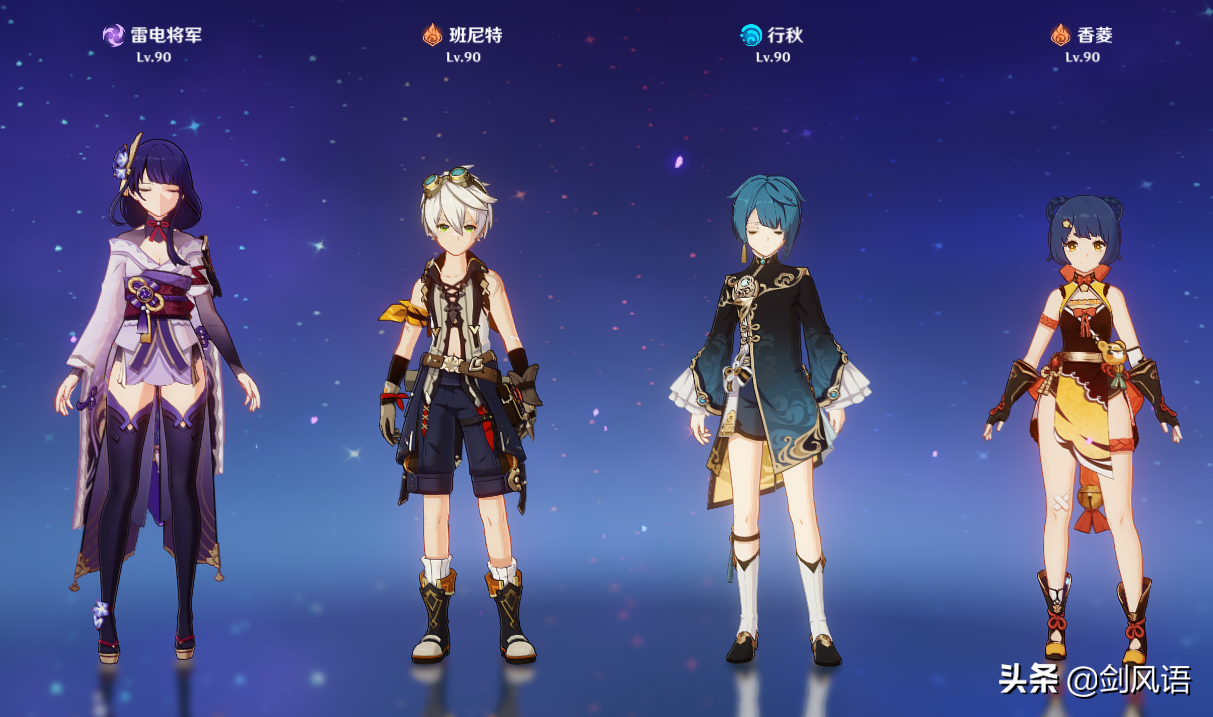 班尼特大招增伤和回血,行秋挂水、减伤和后台输出,香菱挂火和后台输出,雷神站桩开大招打爆发。