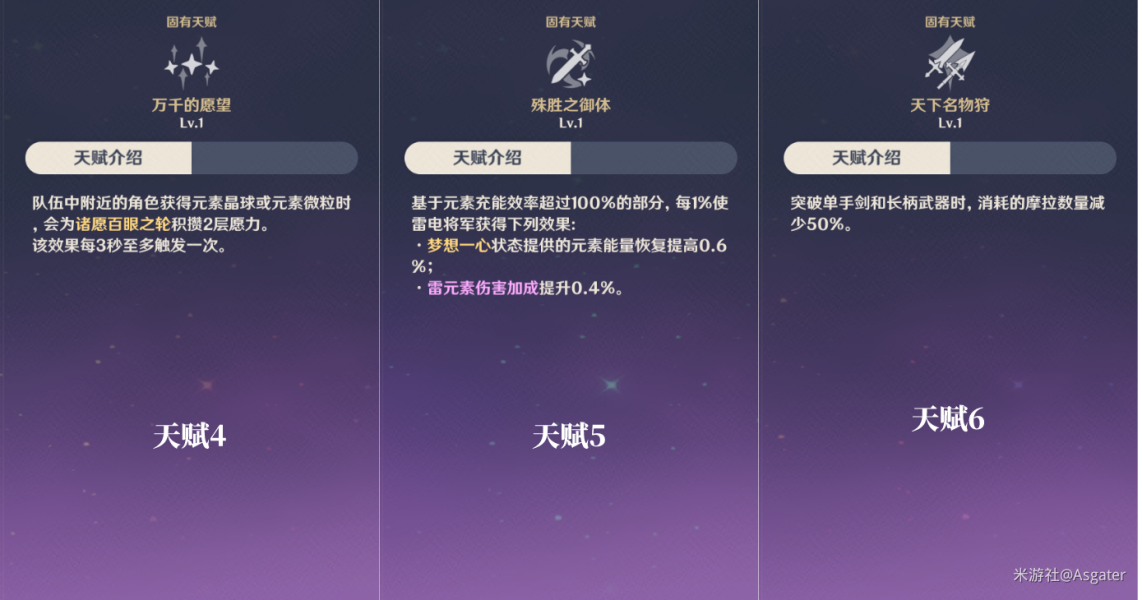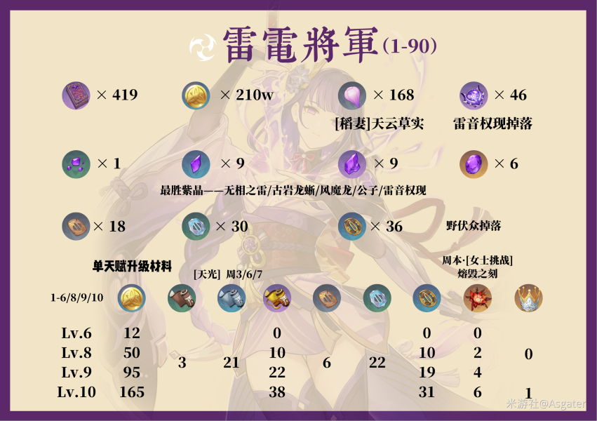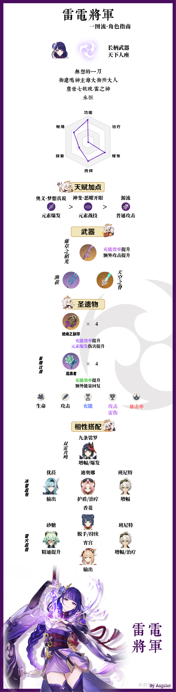 这里是阿斯盖特,这一次是雷电将军的角色指南,长图之后还有内容补充以及角色培养材料图表!